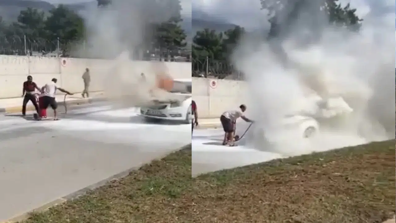 Hatay’ın İskenderun ilçesinde seyir halindeki otomobilde yangın çıktı. Çevredeki vatandaşların müdahalesiyle alevler kısa sürede kontrol altına alındı.