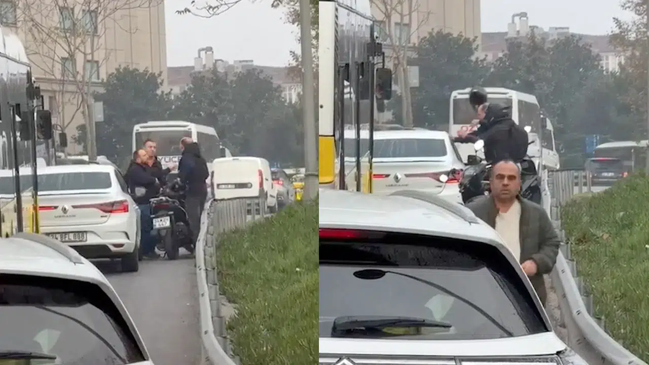 Kağıthane'de motosiklet ile otomobil sürücülerinin yol verme nedeniyle kavga ettiği anlar cep telefonu kamarasıyla kaydedildi.
