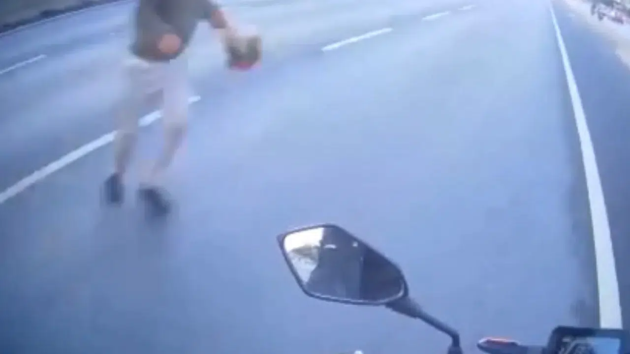 O anlar sağ şeritte ilerleyen bir motosiklet sürücüsünün kask kamerası tarafından saniye saniye kaydedildi. Sürücünün dikkati sayesinde şans eseri ölen ya da yaralanan olmazken, yayanın can güvenliğini hiçe sayan hareketleri sürücülerin tepkisine neden oldu.