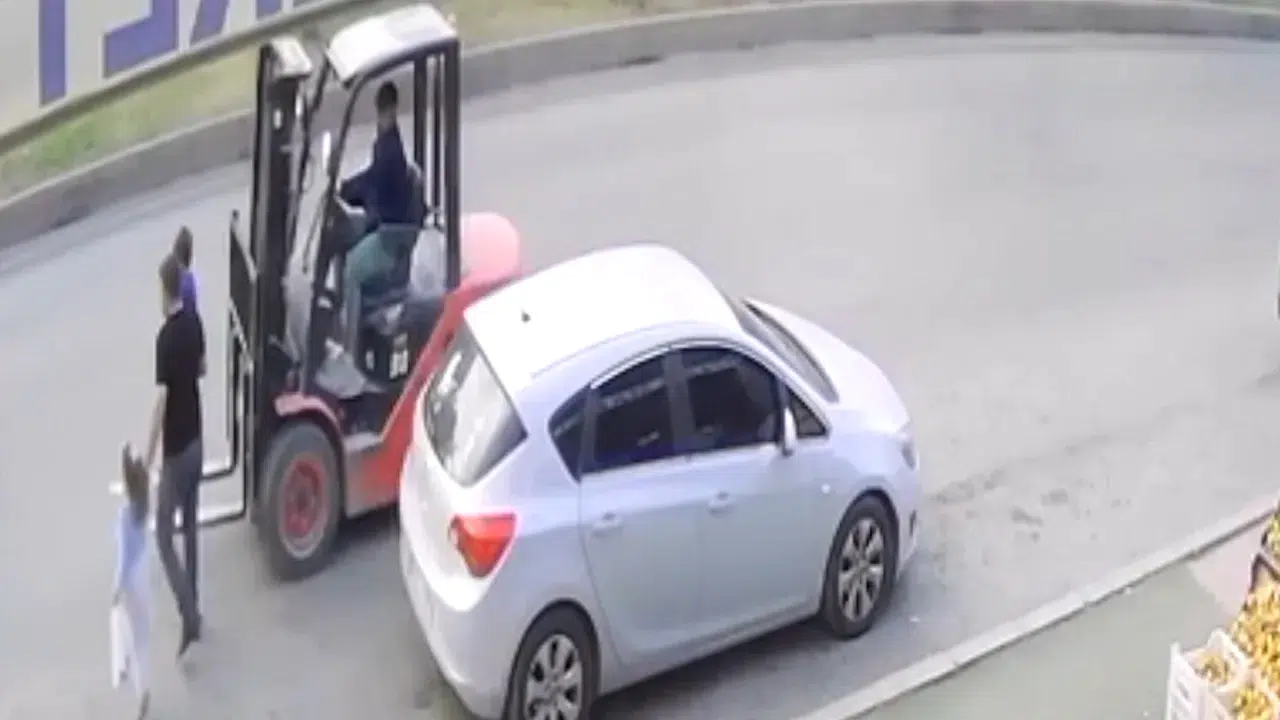 Mersin’in Toroslar ilçesinde ters yönde ilerleyen bir forkliftin, yolun karşısına geçmeye çalışan baba ve iki çocuğuna çarpması güvenlik kamerasına yansıdı.