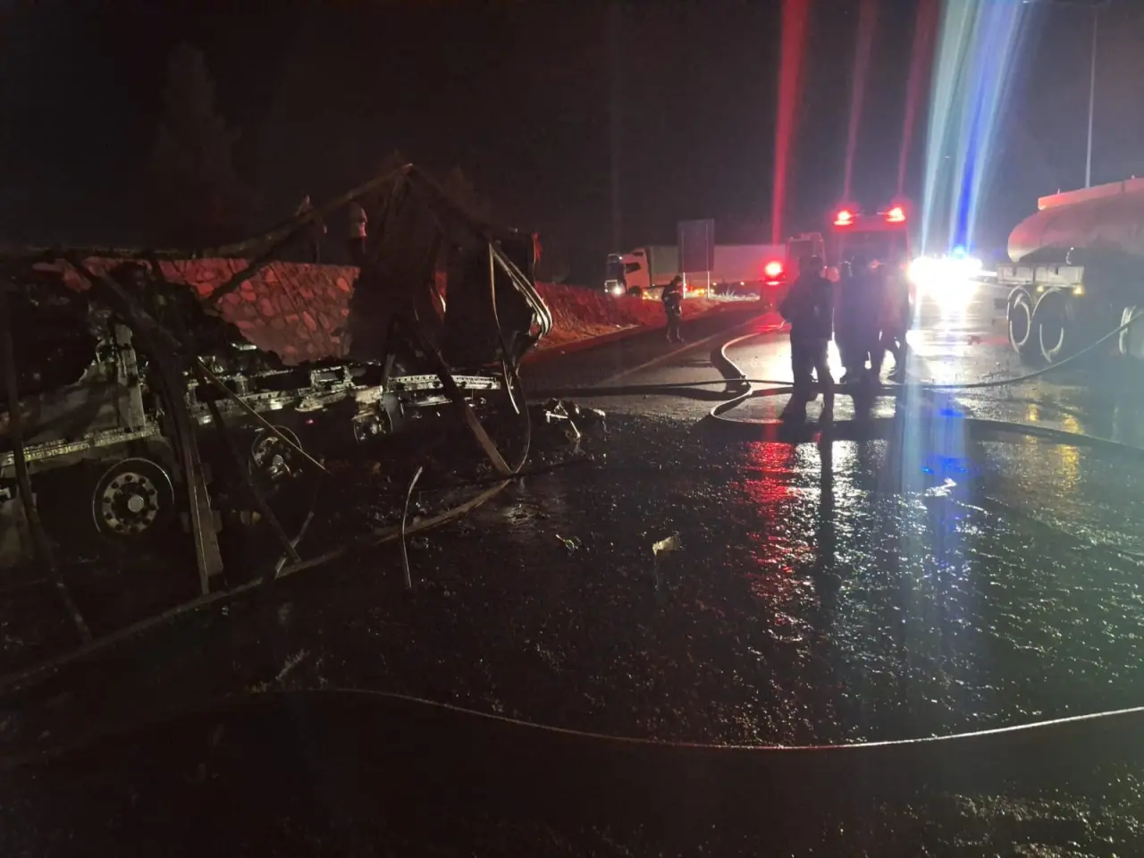 Sürücünün yol kenarına çektiği tır, kısa sürede alev topuna döndü. İhbar üzerine olay yerine giden itfaiye ekipleri, yangına müdahale ederek kontrol altına aldı. Yangın sonrası uluslararası taşımacılık yaptığı belirlenen tır, hurda yığınına döndü. Jandarma ekipleri olayla ilgili inceleme çalışması başlattı. Yangın nedeniyle bir süre kapanan yol, yangının söndürülmesi ile yeniden trafiğe açıldı.