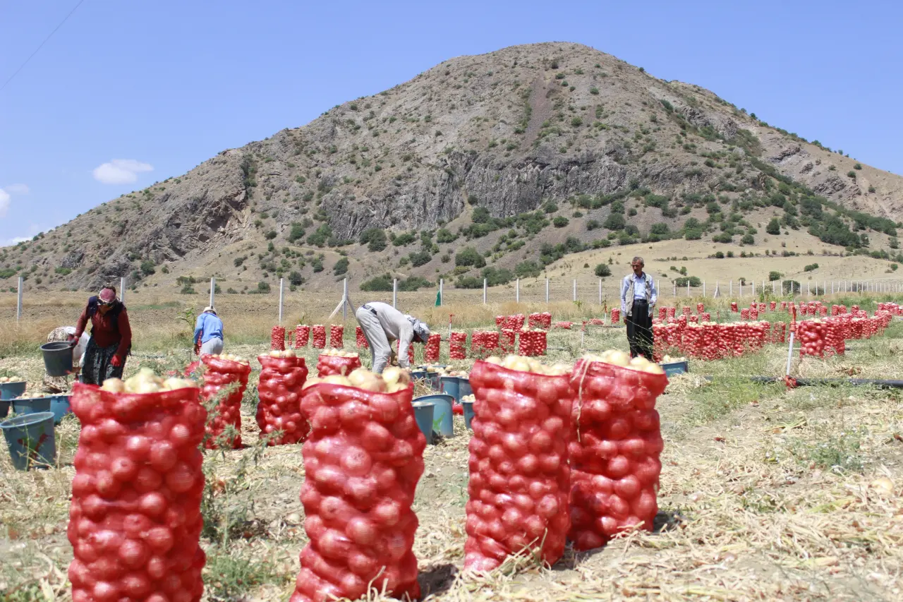 Her yıl yaklaşık 4 bin dekarlık alanda soğan üretiminin yapıldığı bölgede, sabahın ilk ışıklarıyla birlikte tarlaya giren işçiler, gün boyu yoğun mesai harcıyor. 35 dereceyi bulan sıcaklıklarda çalışan işçiler, özenle söktükleri soğanları çuvallara doldurarak satışa hazır hale getiriyor.
