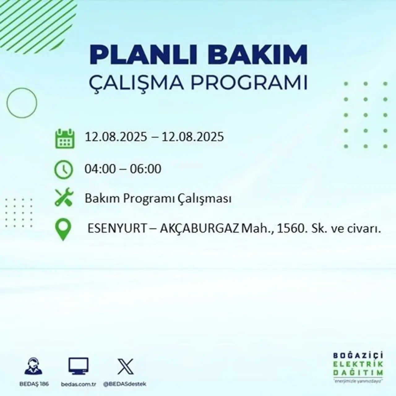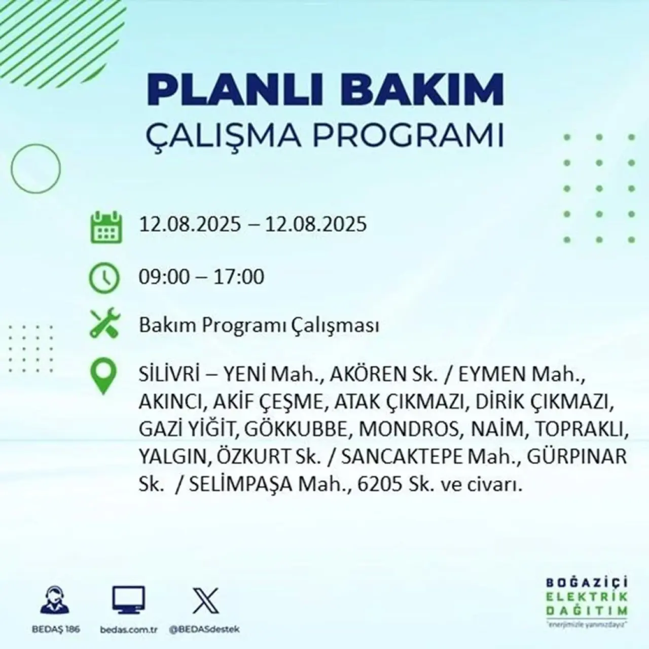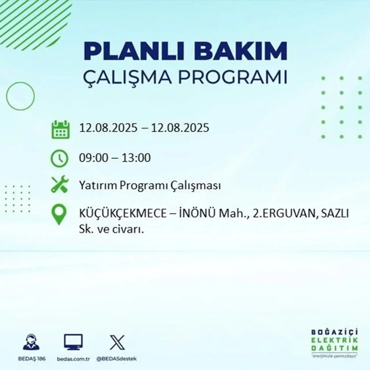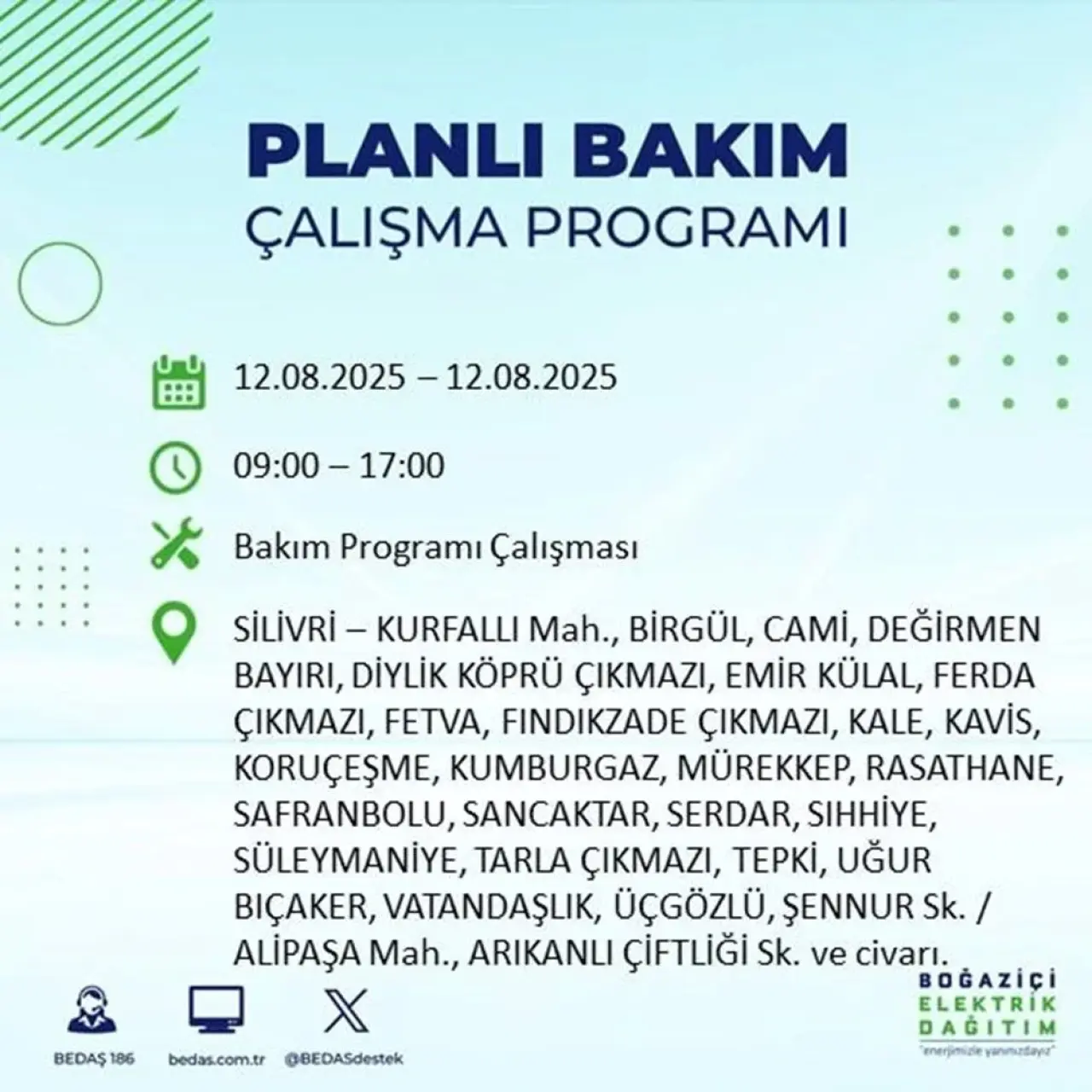 BEDAŞ’ın resmi internet sitesinden yayınlanan bilgiye göre, kesintiler gün boyu sürebilirken, bazı ilçelerde sabah saatlerinden itibaren başlayan kesintilerin akşam saatlerine kadar uzaması bekleniyor.