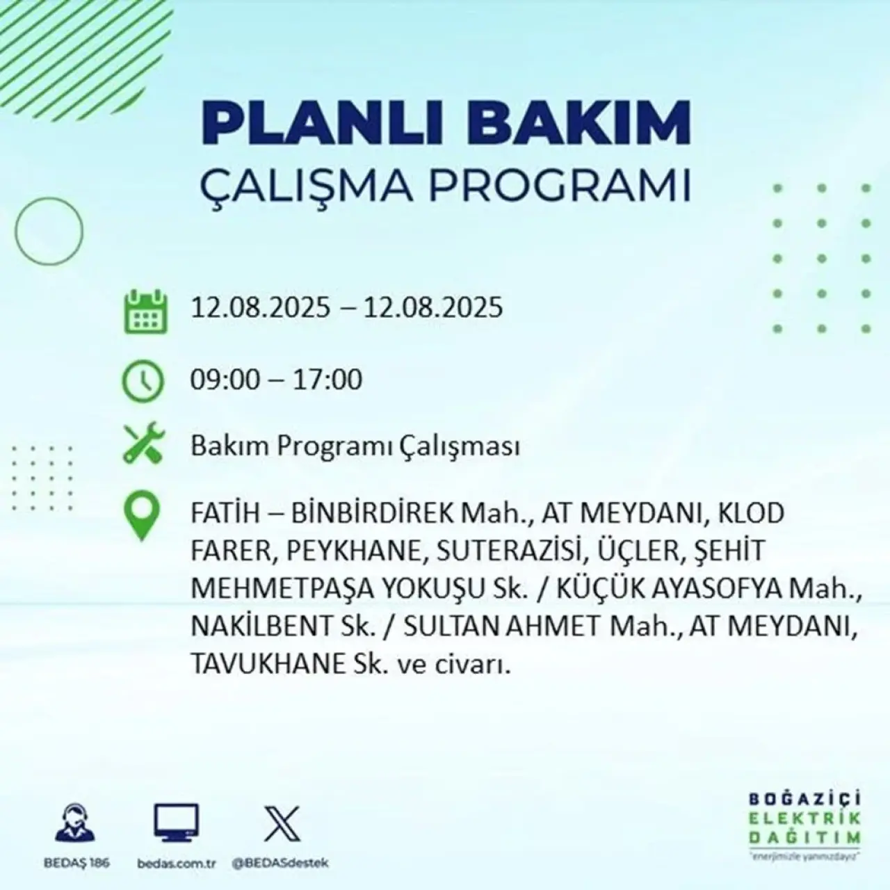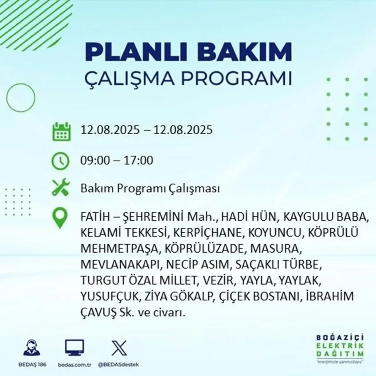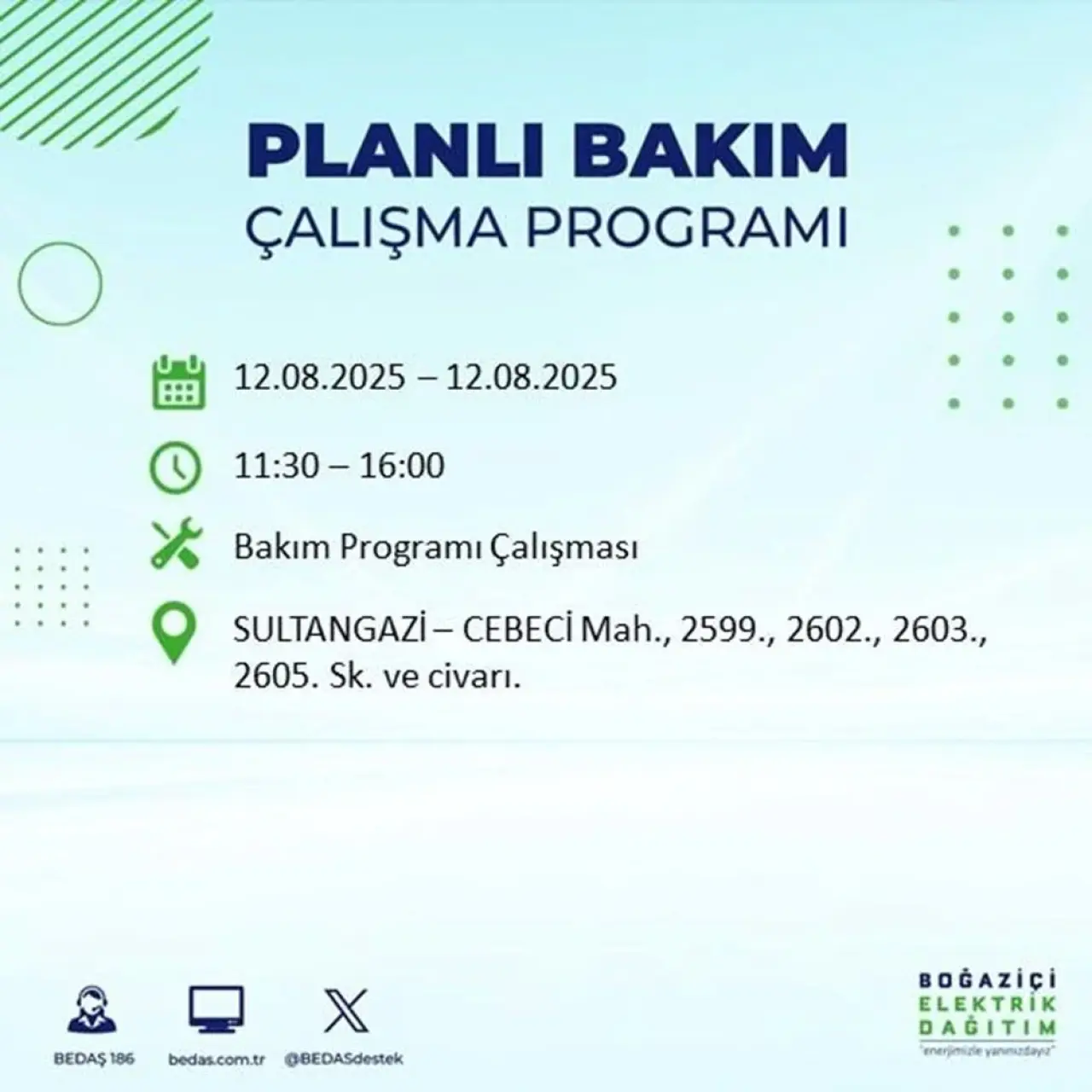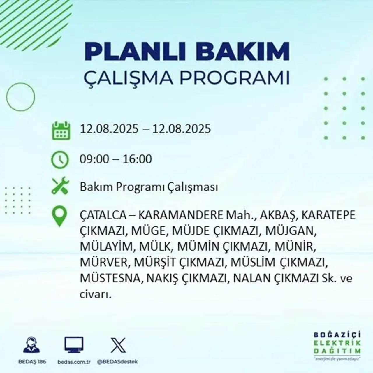 BEDAŞ’ın resmi internet sitesinden yayınlanan bilgiye göre, kesintiler gün boyu sürebilirken, bazı ilçelerde sabah saatlerinden itibaren başlayan kesintilerin akşam saatlerine kadar uzaması bekleniyor.