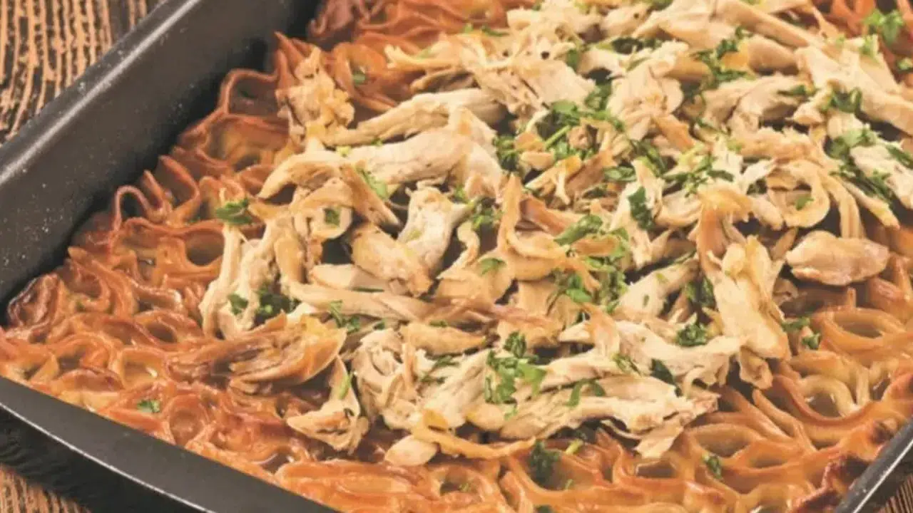 4. Ufalanmış yufkaların üzerine haşlanmış ve didiklenmiş tavukları yerleştirin. Sarımsaklı yoğurdu gezdirdikten sonra salçalı sosu ekleyin.