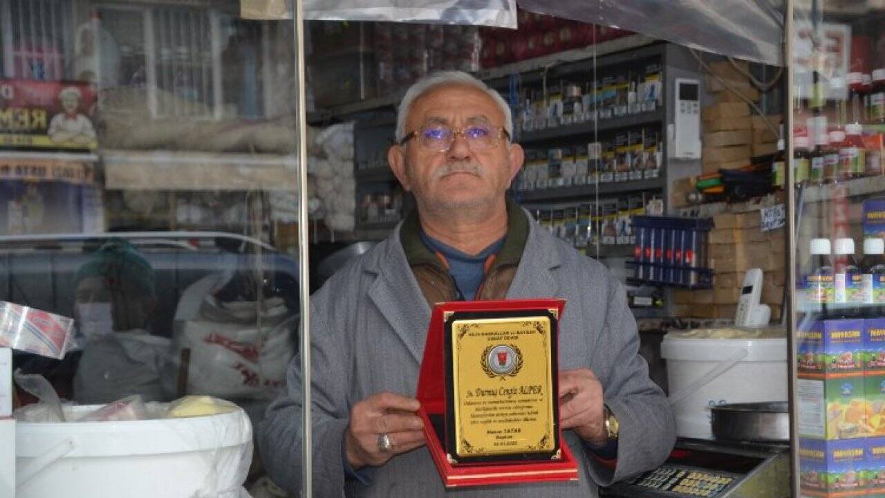 Kilis’te 120 yıl önce faaliyete başlayan bakkal dükkanını işleten Durmuş Cengiz Alper’e plaket verildi.KİLİS (İGFA)- Bundan 120 yıl önce Cumhuriyet Caddesi’nde babasının amcası Mehmet Yılanoğlu tarafından açılan