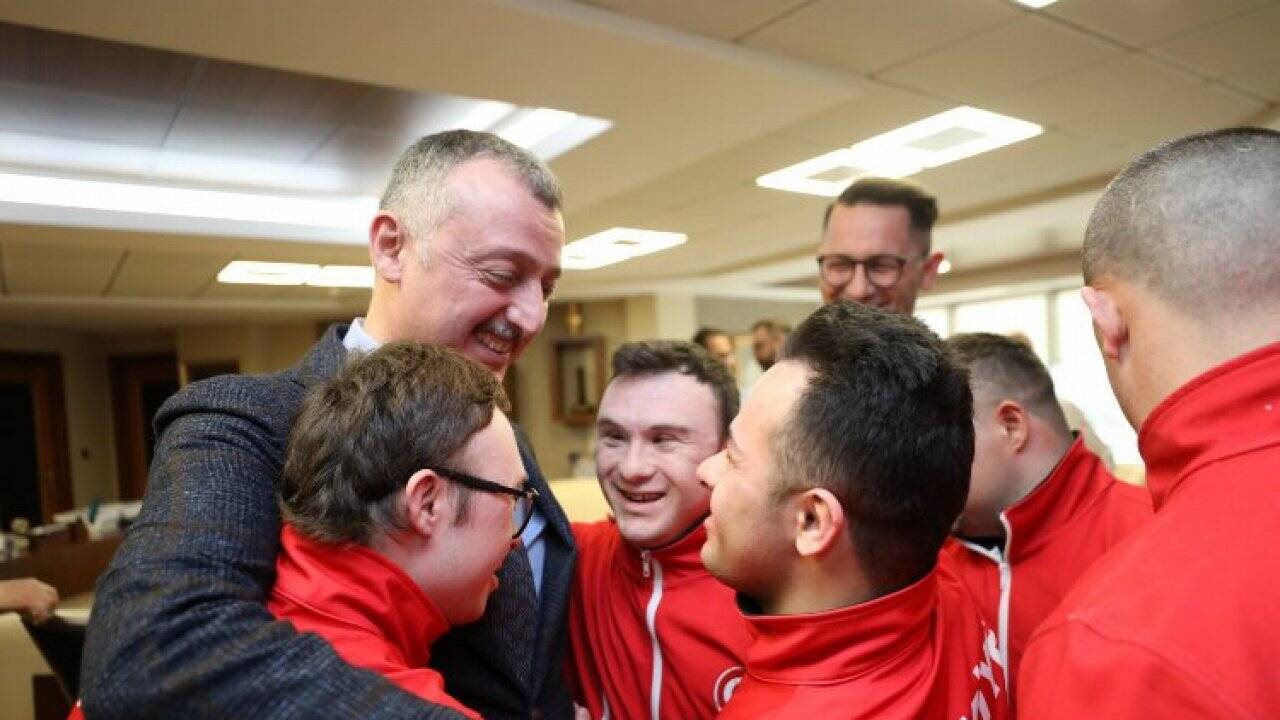Başkan Büyükakın’ı makamında ziyaret eden Down Sendromlular Futsal Milli Takımı sporcuları, Cumhurbaşkanı Erdoğan’a verdikleri sözü tutacaklarını ifade etti.KOCAELİ (İGFA)- Marmara Belediyeler Birliği ve Kocaeli Büyükşehir Belediye Başkanı Doç. Dr. Tahir Büyükakın, 01–10 Nisan 2022 tarihleri arasında Peru’da düzenlenecek olan Dünya Şampiyonası hazırlıklarını, 23-24 Mart tarihleri arasında Kocaeli Büyükşehir Belediyesi Gençlik ve Spor Hizmetleri Dairesi Başkanlığı’nın katkıları ile Kocaeli’ndeki kampta tamamlayan Down Sendromlular Futsal Milli Takım Sporcularını ve Milli Antrenörleri makamında ağırladı. 2022 Dünya Şampiyonası için hazırlık kampını Kocaeli Büyükşehir Belediyesi’nin ev sahipliğinde sürdüren Türkiye Özel Sporcular Spor Federasyonu Down Sendromlular Futsal Milli Takımı oyuncuları, ‘’Dünya Şampiyonu olarak, Cumhurbaşkanımız Tayyip Erdoğan'a verdiğimiz sözü tutup Dünya Kupası’nı kendisine hediye edeceğiz’’ müjdesini verdi.